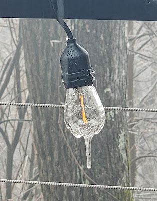 Been sitting at 30/31 degrees for several hours here at the end of Staymon, and vegetation has a nice coating of ice, especially any evergreens, which are drooping down into the roads. The National Weather Service posted our area in the advisory which you can read about HERE. Icing is most evident above the double hairpin curves, elevation-wise. We need a lot of things, but a third consecutive day of power outages isn't one of them.